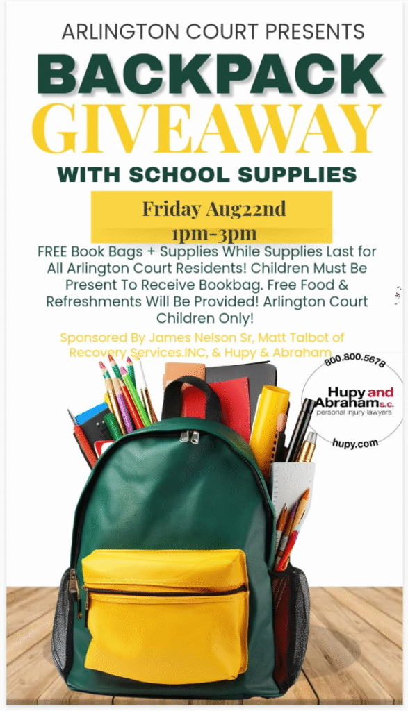 On August 22, 2025, Matt Talbot Recovery Services Inc. contributed toward the Back to School Book Bag Giveaway at Arlington Court’s Community Room, managed by the City of Milwaukee Housing Authority.