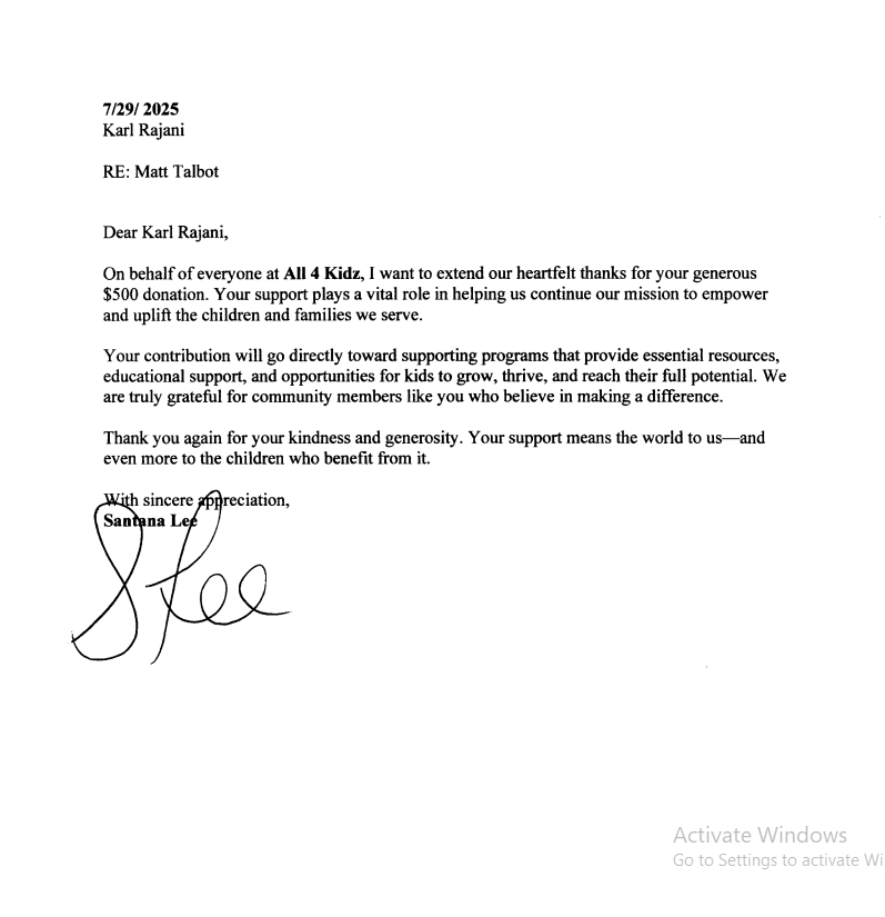 Recently, our contributions have benefited All 4 Kidz Inc., an organization established to create secure environments for young individuals in the foster care system, fostering emotional healing and enhancing mental health awareness. All 4 Kidz is committed to offering essential support services to children navigating the complexities of the child welfare system and dealing with trauma. The organization conducts life skills training and workshops, equipping foster youth with vital skills to navigate adulthood. We derive great satisfaction in our contribution to their success and are pleased to have played a role in supporting their mission.