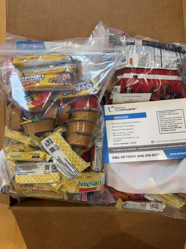 We prepared bagged lunches with sandwiches, fresh fruit, snacks, water, and juice. Additionally, we provided clothing items like socks, undergarments, t-shirts, shorts, and jogging pants. The hygiene kits included razors, toothbrushes, toothpaste, tissues, wipes, and deodorant. Each hygiene bag also contained business cards and pamphlets with information about our detox program, mental health counseling services, and medication management offered through American Telepsychiatry.